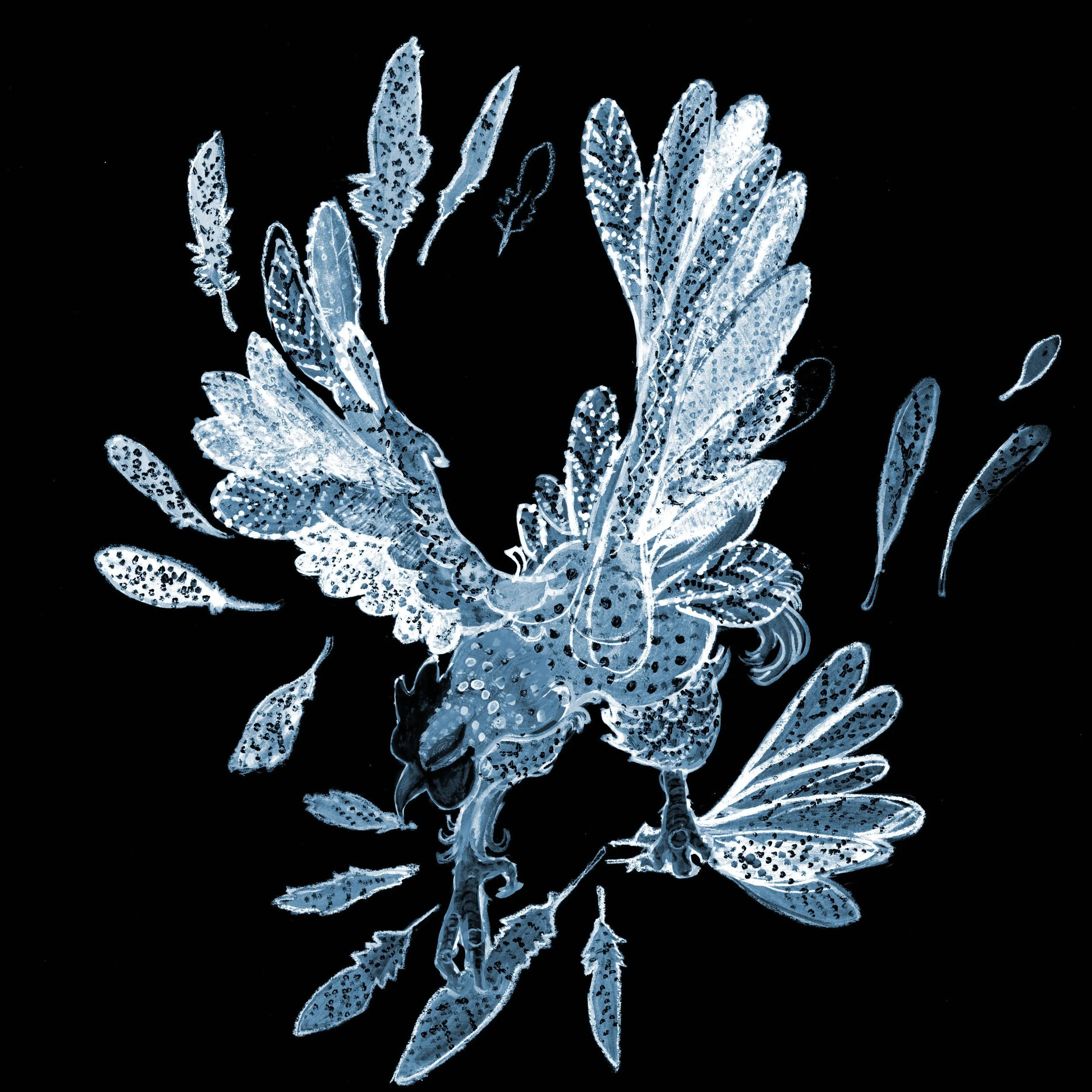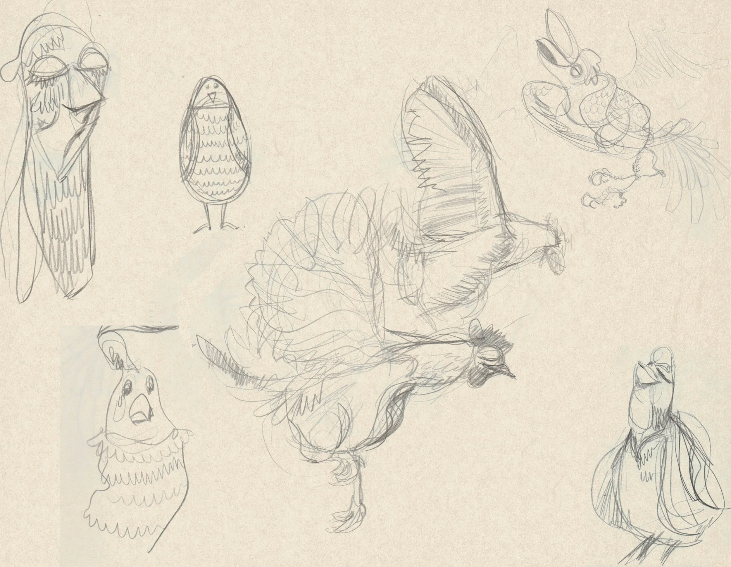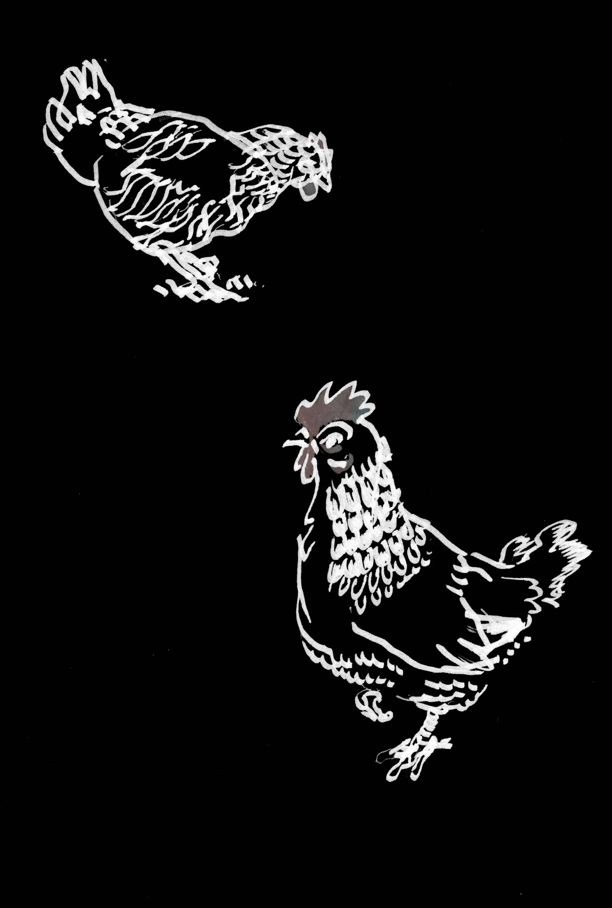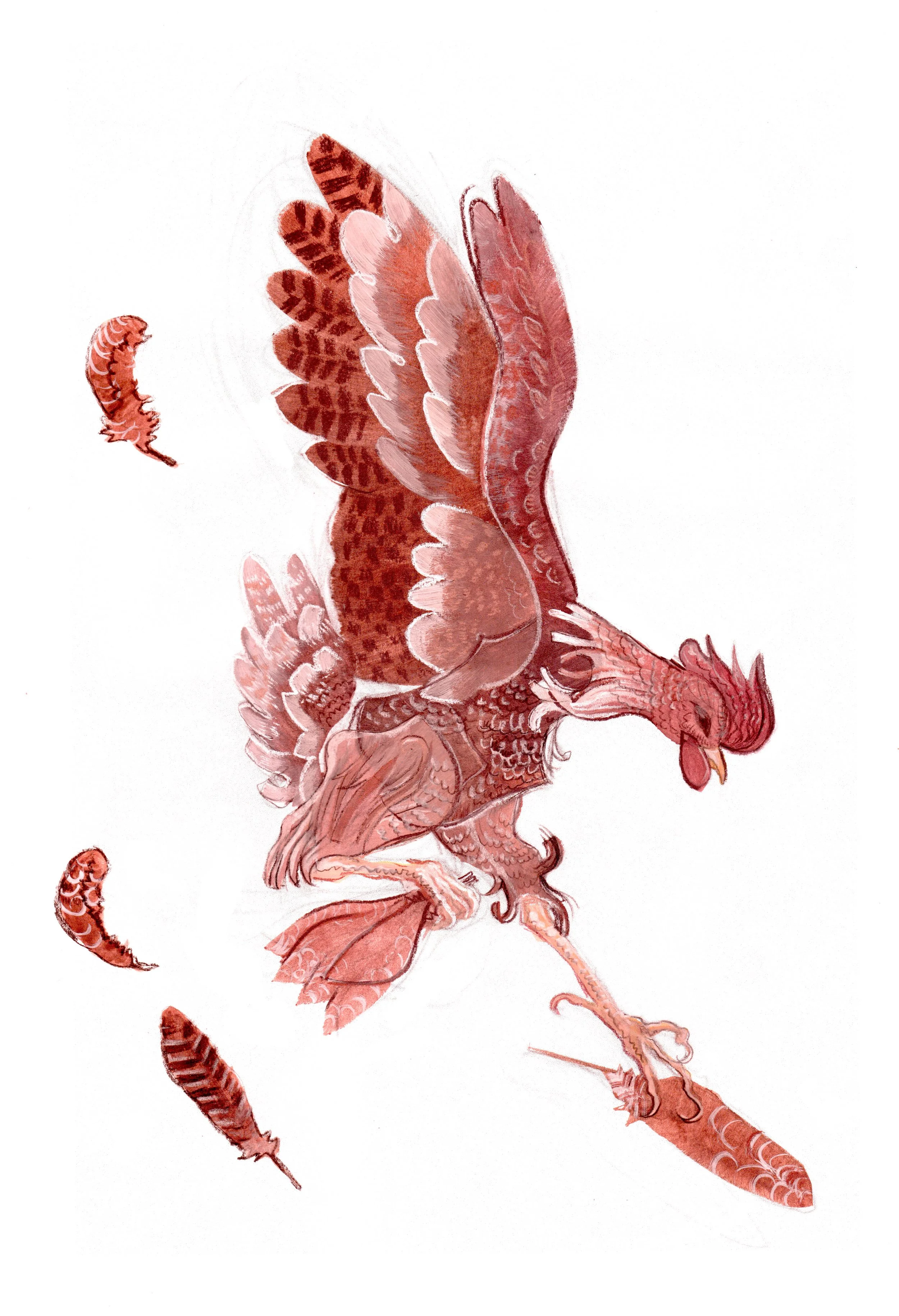 Kiik asked me to illustrate the poem so I spent some time thinking about it. I wanted to draw the moment where the Hen character gathers her memories or feathers as they flutter away in a wild mess. The Hen is a symbol for Kiik's mother, and maybe Kiik sees this desire to cherish and maintain her memories as defying mortality. To me its equal parts tender, tenacious, and futile, so I explored a lot of styles - cartoony, silly, sketchy, colorful and patterned. Looking back at the image I feel that the gestural work done in fountain pen connects most closely to the words.