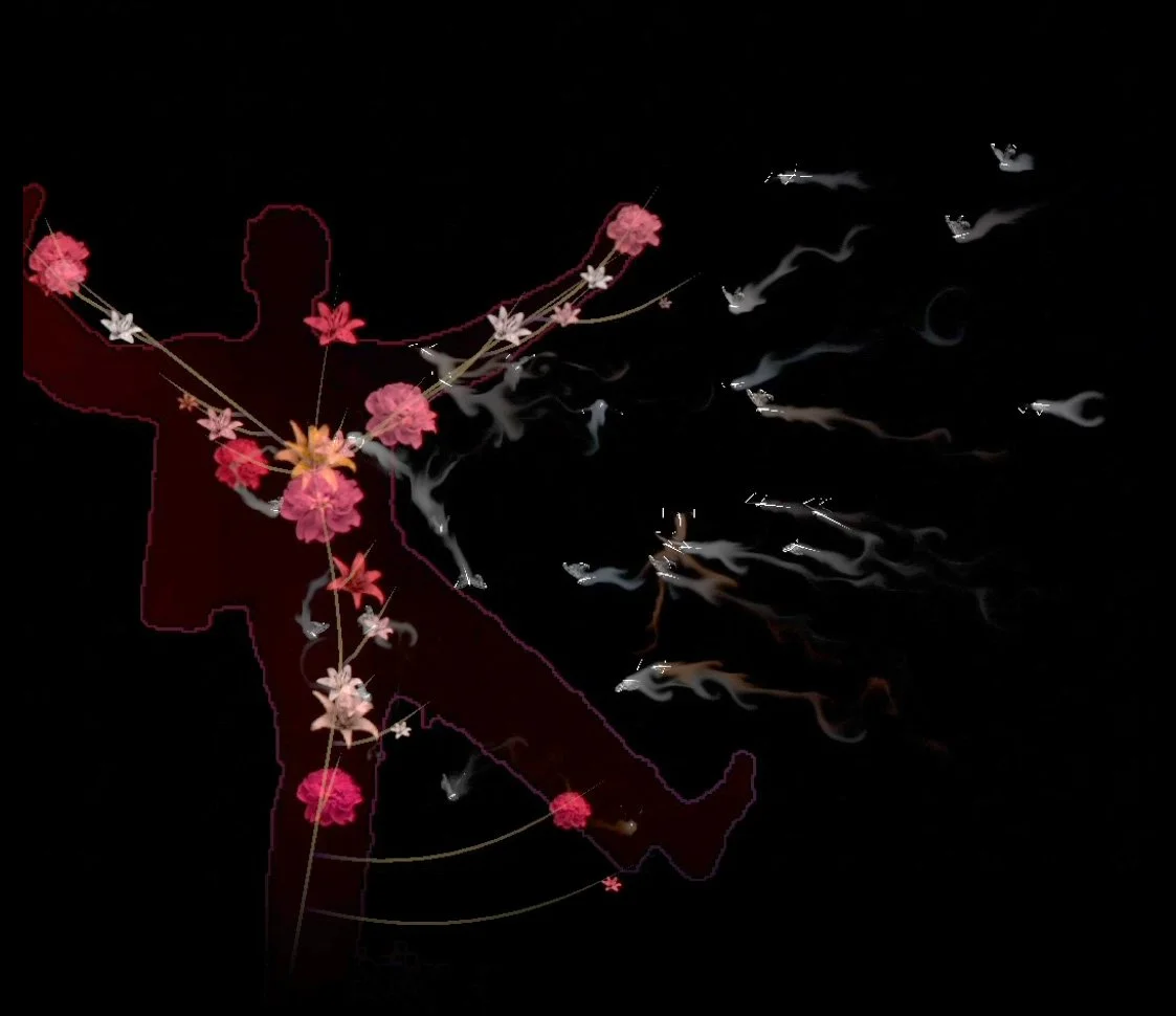 Posies is an interactive piece that responds to the viewer’s movements, inspired by the LA river. When you move too quickly, the installation gets “scared” and seems to be inactive, but if you slow down and hold still, plants grow into your silhouette and the flowers attract insects and butterflies.