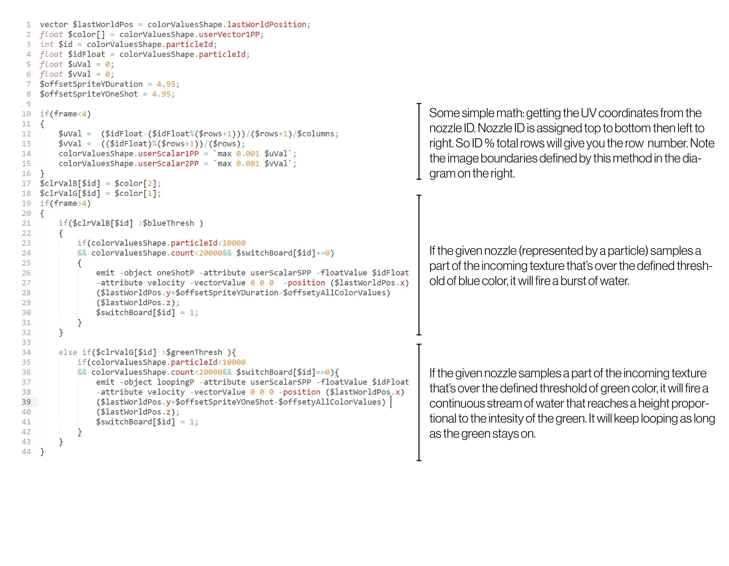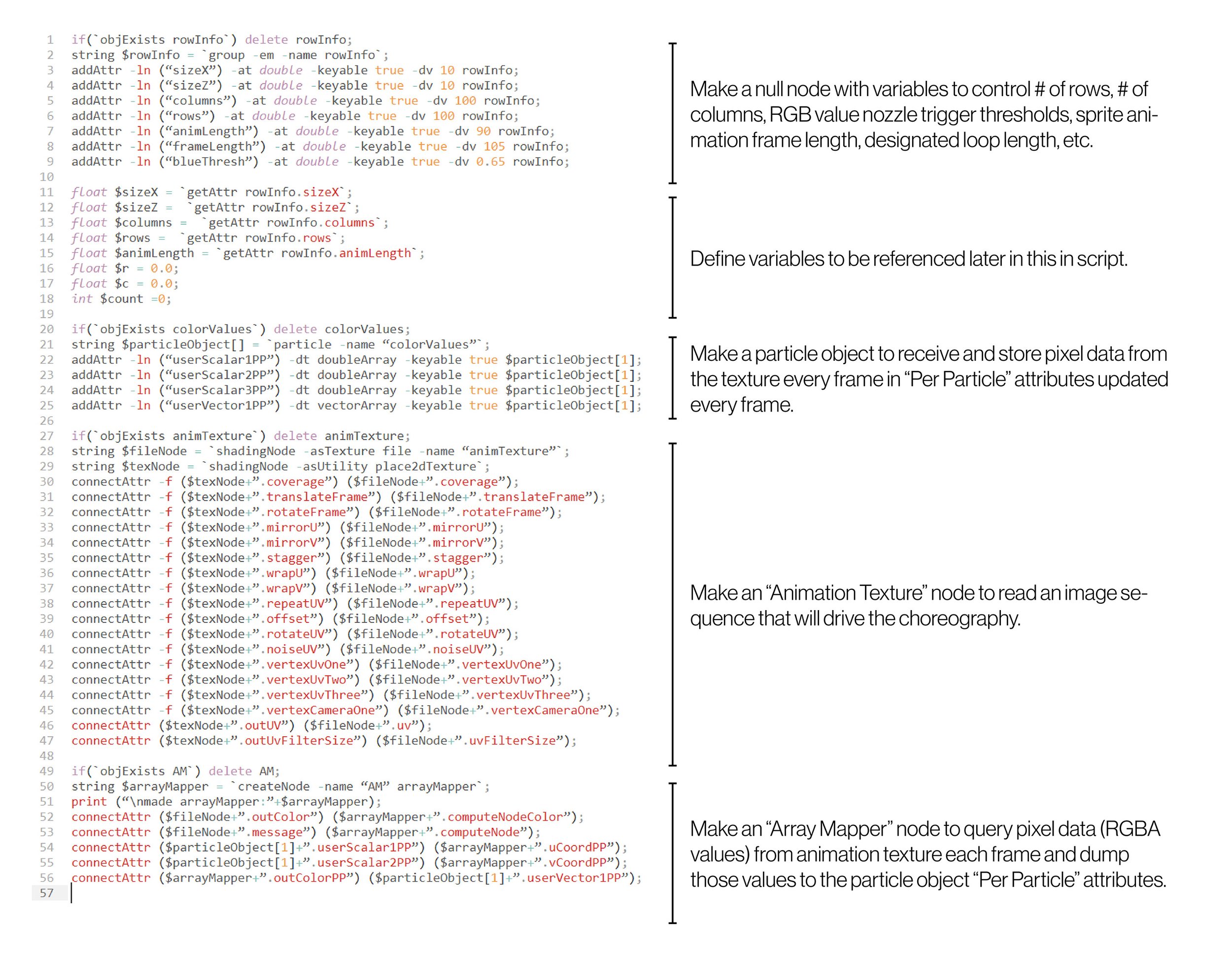Expressions in Maya are snippets of code that execute every frame of an animation. I wrote the following expressions to use the incoming texture data to manage nozzle properties like emission, height and frame number. The first expression creates the virtual grid of nozzles and the associated physical properties.