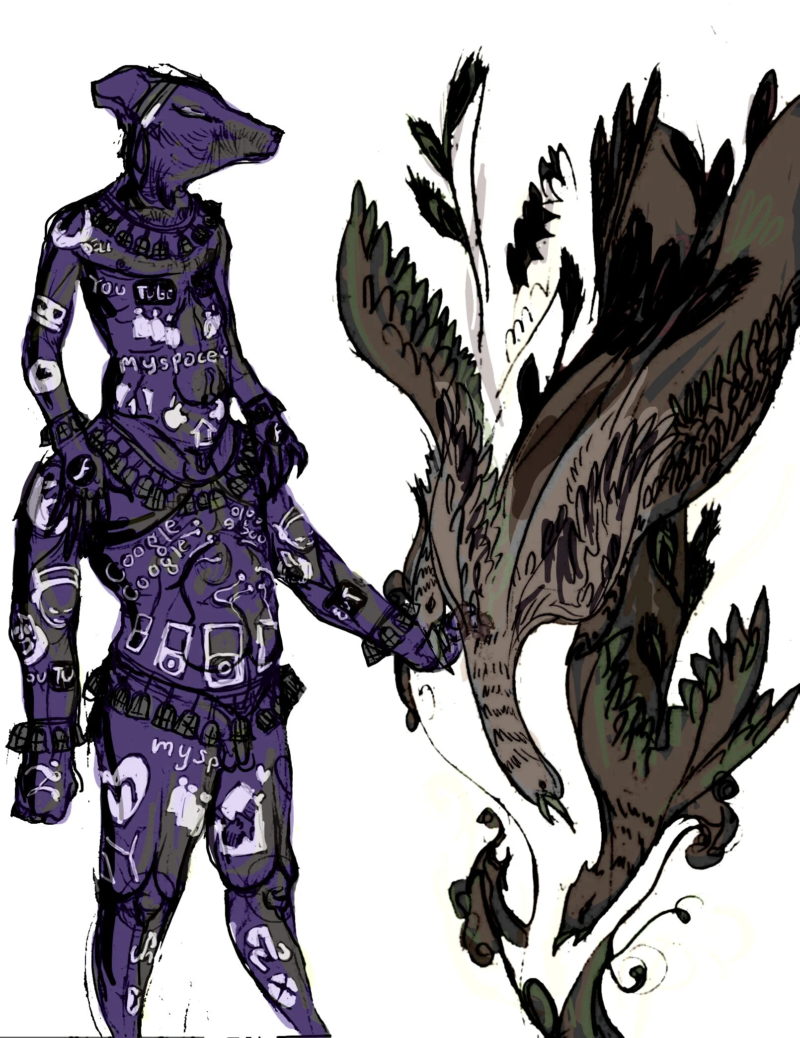 Durga went to fight Mahisha, and encountered waves of his forces. The poem goes into bloody detail about this battle for many pages. It describes Durga cleaving her enemies in half with swords and decapitating them with her weapons. Dead Asura continue fighting like headless chickens, and others keep playing their instruments. As I mentioned above the author Upendra Nath Dahl thinks this might be based on some sort of historical conflict between Indus valley settlers and Aryan new-comers (possibly invaders). So in some ways this part of the story is not unlike the Odyssey or the Iliad - it's a glamorization of war. I guess at least some of this is also simply for entertainment, so I thought it would be fun to play around with different ways of modernizing or poking fun at the violence. Though now dated, when I was drawing this in 2005 I thought it would be funny to include xbox controllers, playstation controllers, jack-in-the-box harpies, and more :) You may notice I also tattooed Mahisha with some corporate logos from the early 2000s.