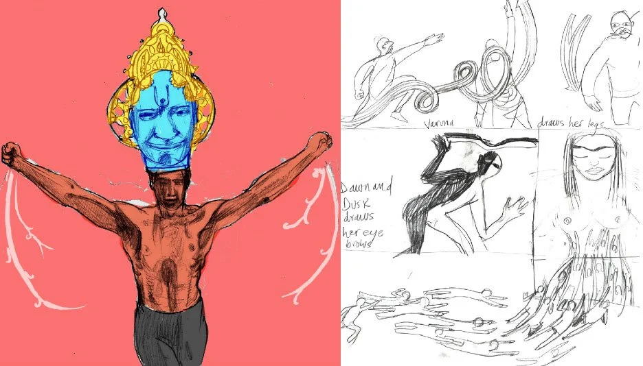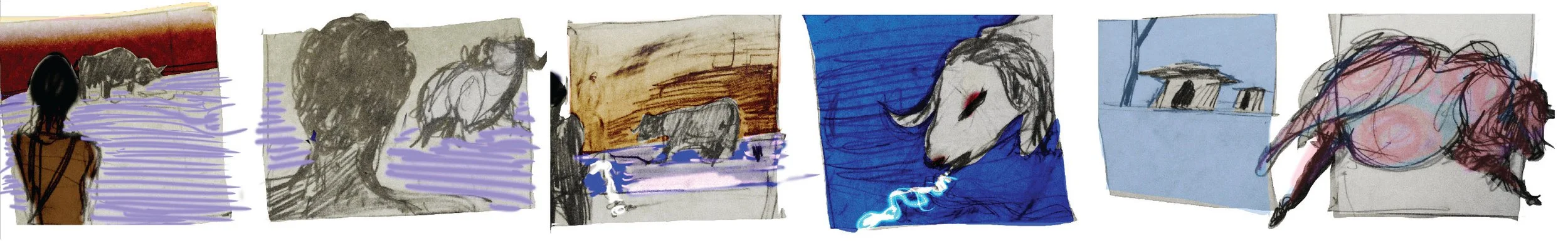 The myth of Mahisha is a complex, multifaceted narrative with its origins in ancient India. I started working on these drawings because of a desire to investigate the evolution of some key decorative patterns in Indian sculpture and painting. I wasn't sure what form my investigation would take - something between a graphic novel and animation. I think I was drawn to the story of Mahisha because of the number of incarnations it has enjoyed over the centuries.