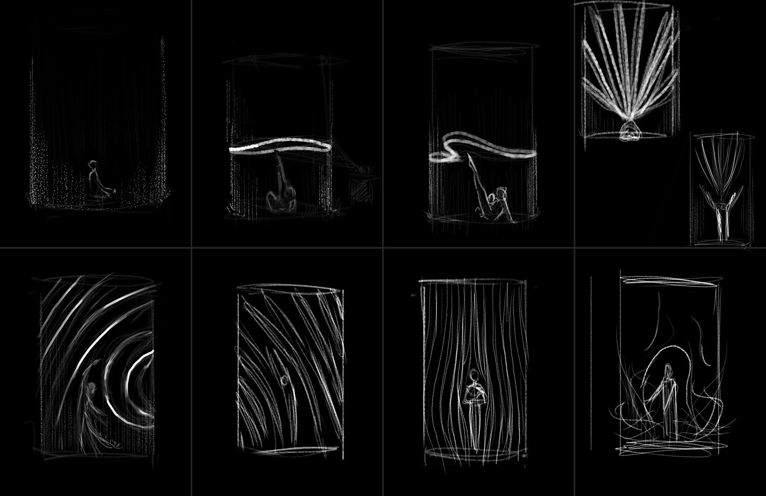 I wanted to create a space where water and light respond to the motion of the dancer, creating a collaborative feedback system. Each of these sketches represents a different way of translating and abstracting the dancer's movements into shapes and imagery. Beyond the interaction between the dancer and projection, the way that water captures and transmits light is beautiful. Each droplet of water is like a tiny prism and breaks up the beam from the projector into a little rainbow. As you walk around the ring the colors shift. Also, the water is a volume and not a flat plane, so it extrudes the image into a 3 dimensional shape. Because the projector is designed to focus within a predefined range, I can control the sharpness of the image based on the dimensions of the curtain and the placement of the projector.